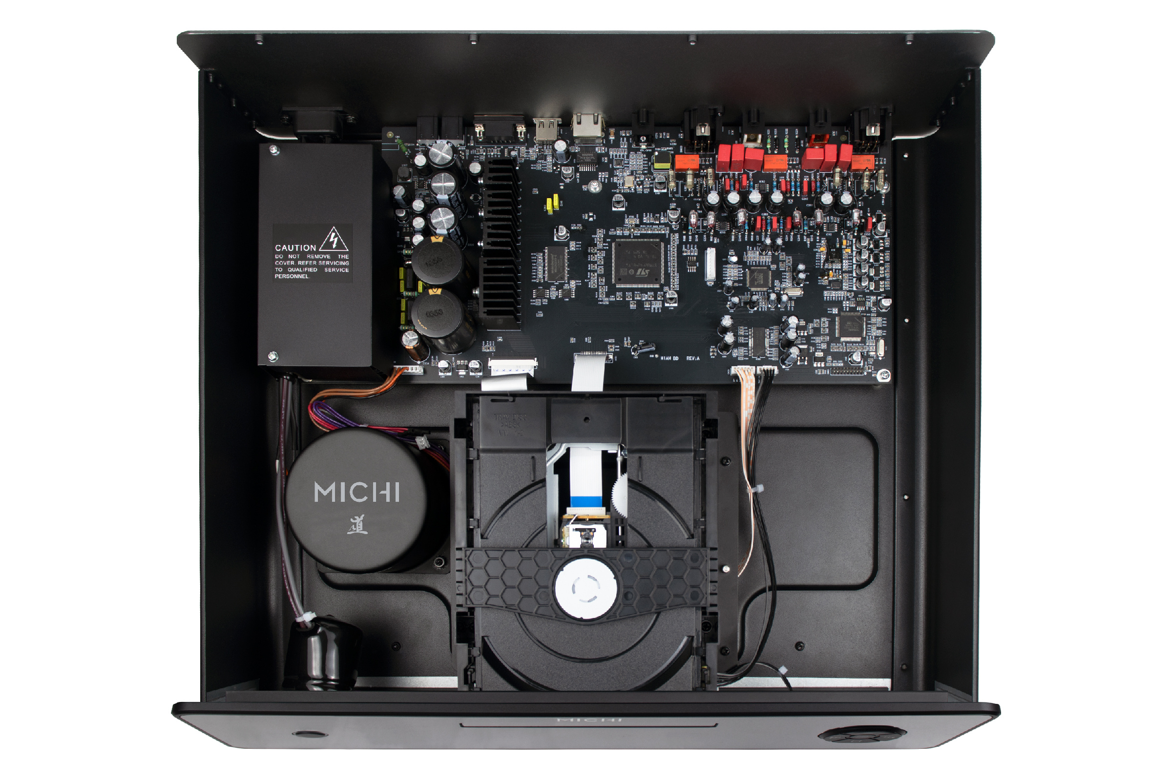 Michi Prestige Q430 даёт ответ именно через конструкцию. В основе лежит прецизионный лотковый механизм с плавающим креплением, которое существенно снижает влияние внешних и внутренних вибраций на процесс считывания. Это решение работает не изолированно, а в тесной связке с системой питания: применена многоступенчатая схема стабилизации, при которой каждая чувствительная зона получает собственное изолированное питание. Главная цель — максимально снизить шумы и пульсации, удерживая общий уровень шума (noise floor) на предельно низкой отметке.