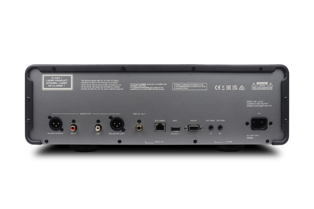 Коммутационные возможности рассчитаны на разные сценарии использования. Устройство оснащено аналоговыми выходами RCA, балансными выходами XLR и цифровым коаксиальным выходом. Благодаря этому Q430 может выступать как самостоятельный источник сигнала с высоким качеством аналогового выхода, так и транспорт в составе более сложной системы.